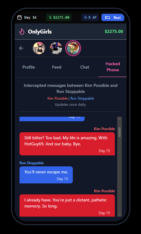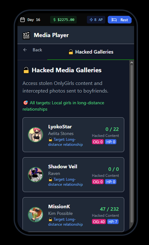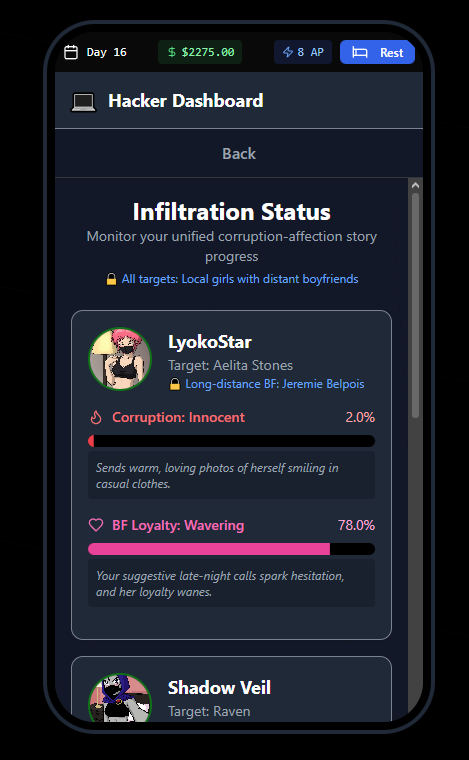 You play as a hacker, navigating a 60-day time limit on your in-game phone. Your goal: corrupt various girls away from their boyfriends through strategic interaction on OnlyGirls (a fictional adult content platform).
