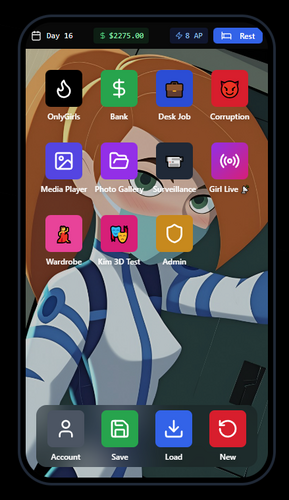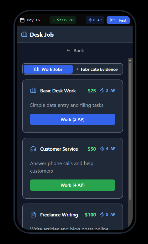 - Desk Job App - Work to earn money (costs AP, earns cash)
